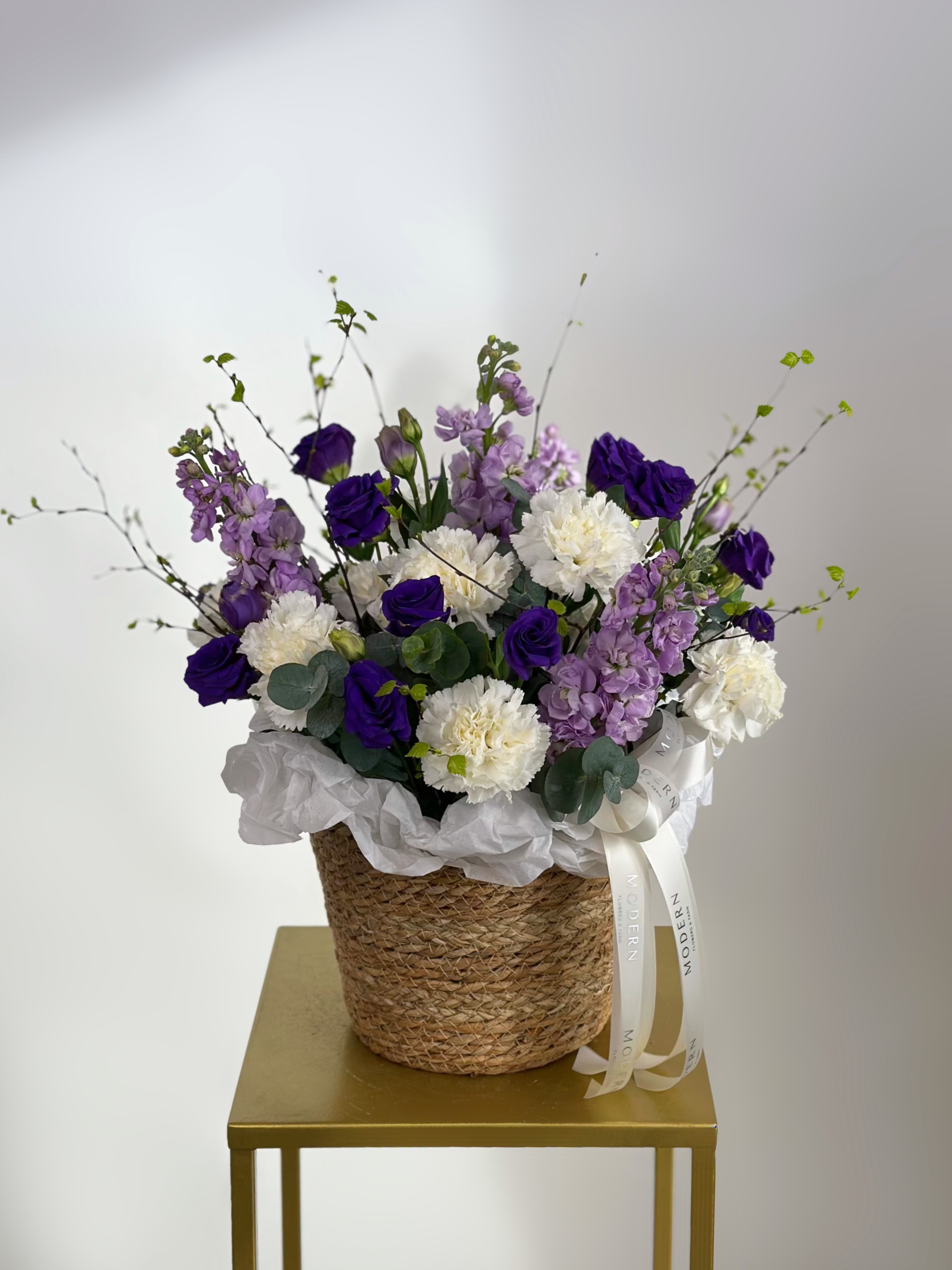 АРОМАТНАЯ МАТТИОЛА, ЭУСТОМА, ВЕСЕННИЕ ВЕТОЧКИ В ПЛЕТЕНОЙ КОРЗИНЕ