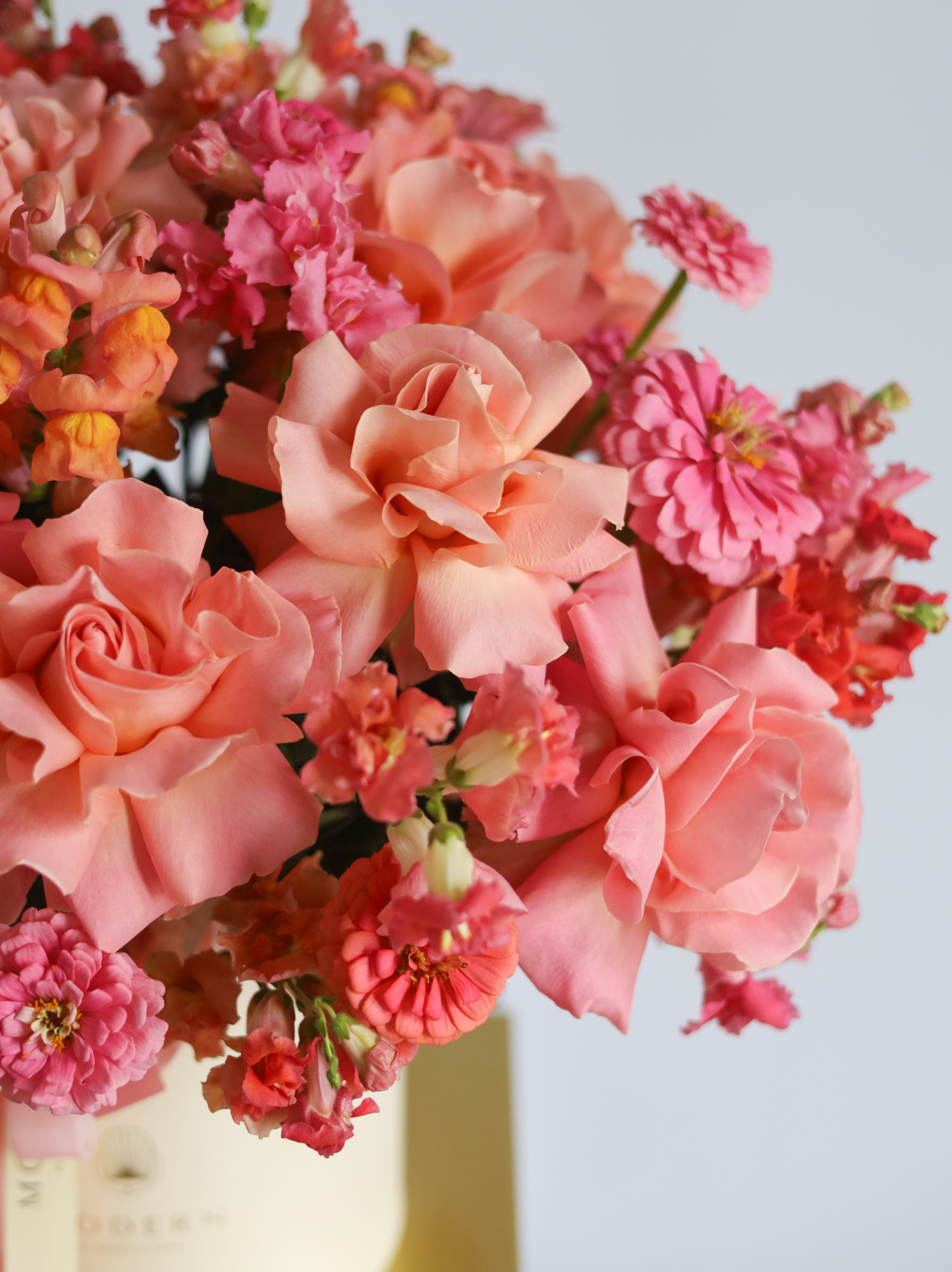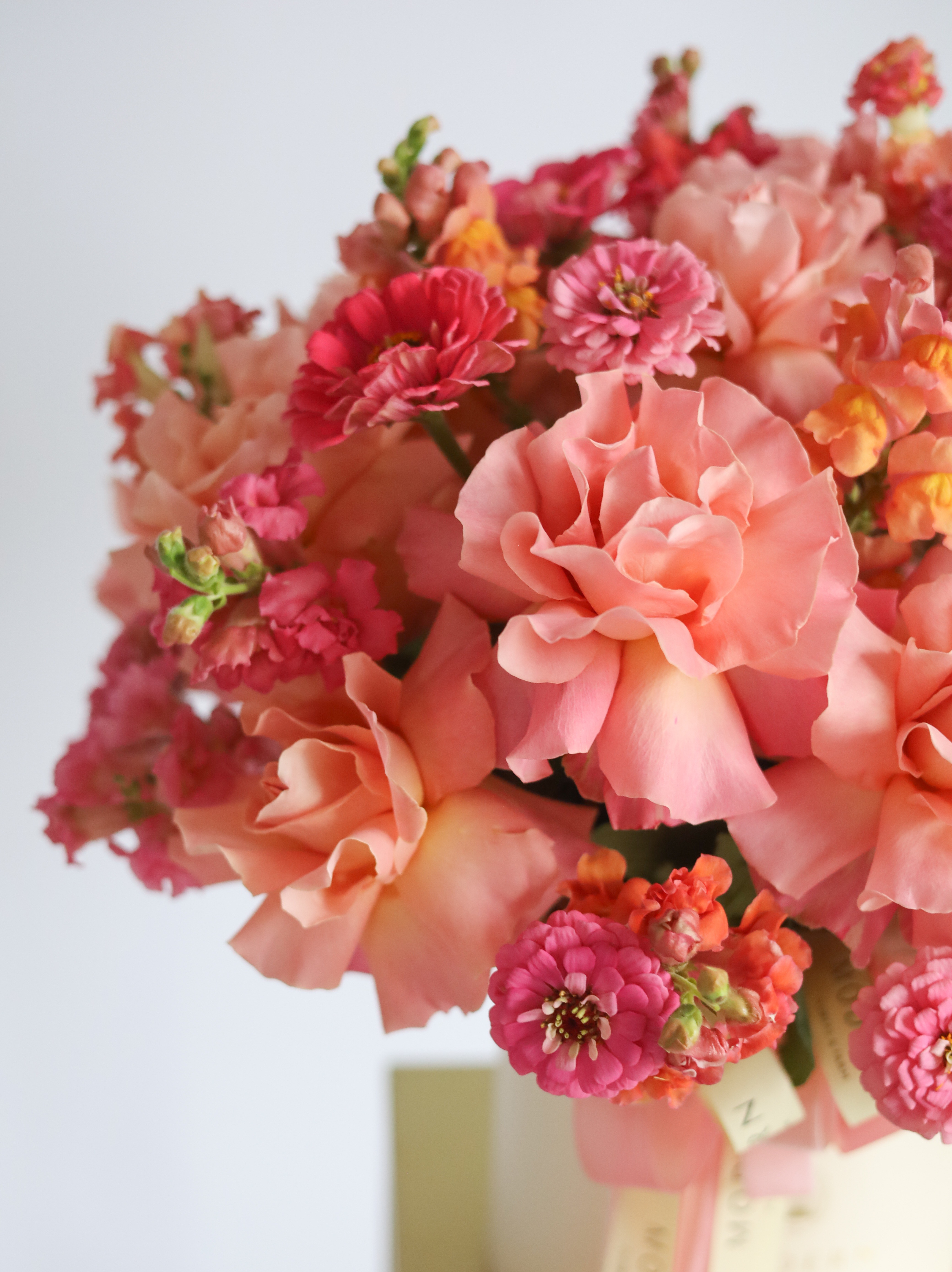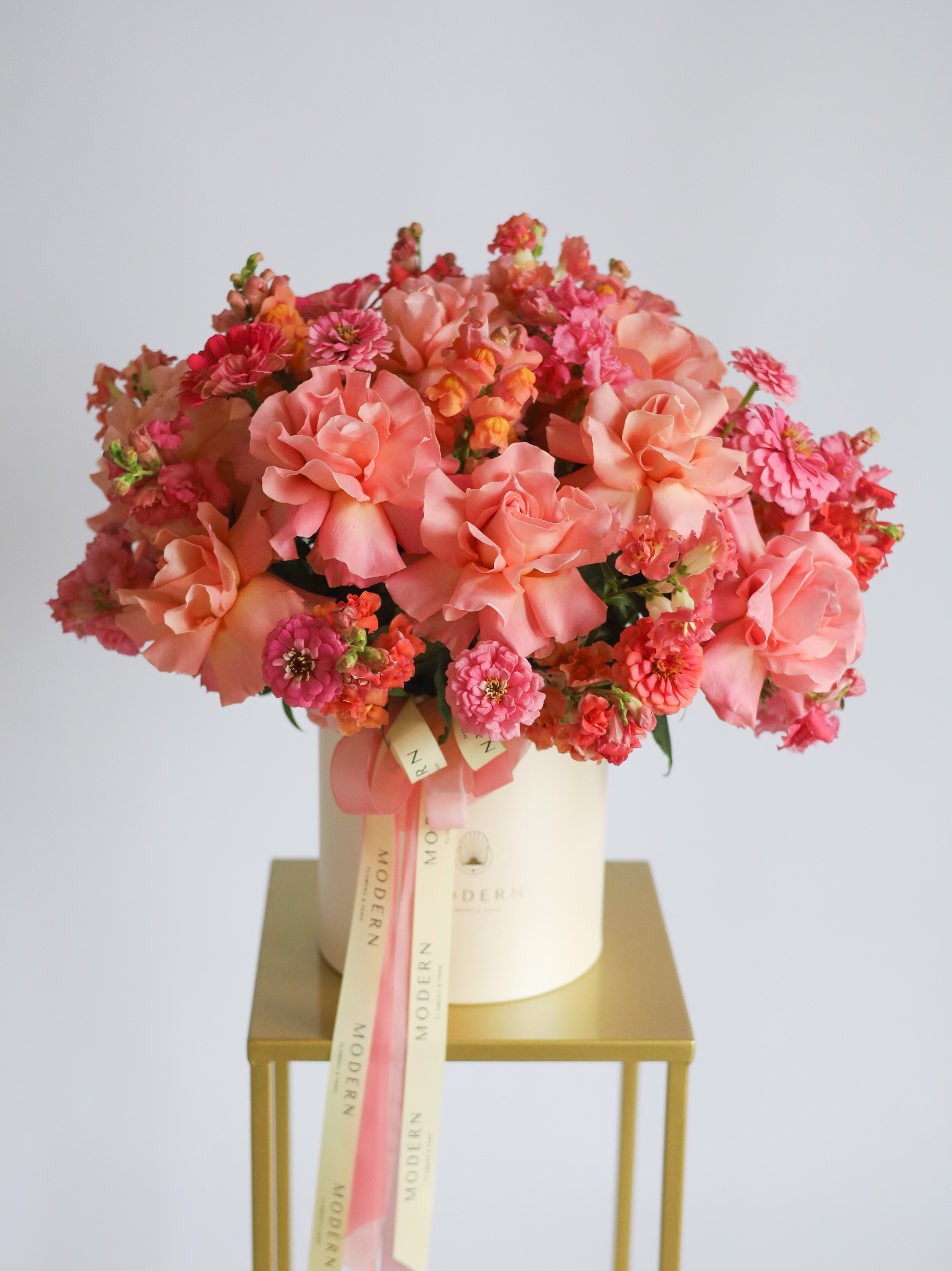Цинния добавляет композиции яркости и объема, привнося в букет нотки природной свежести и жизнерадостности.