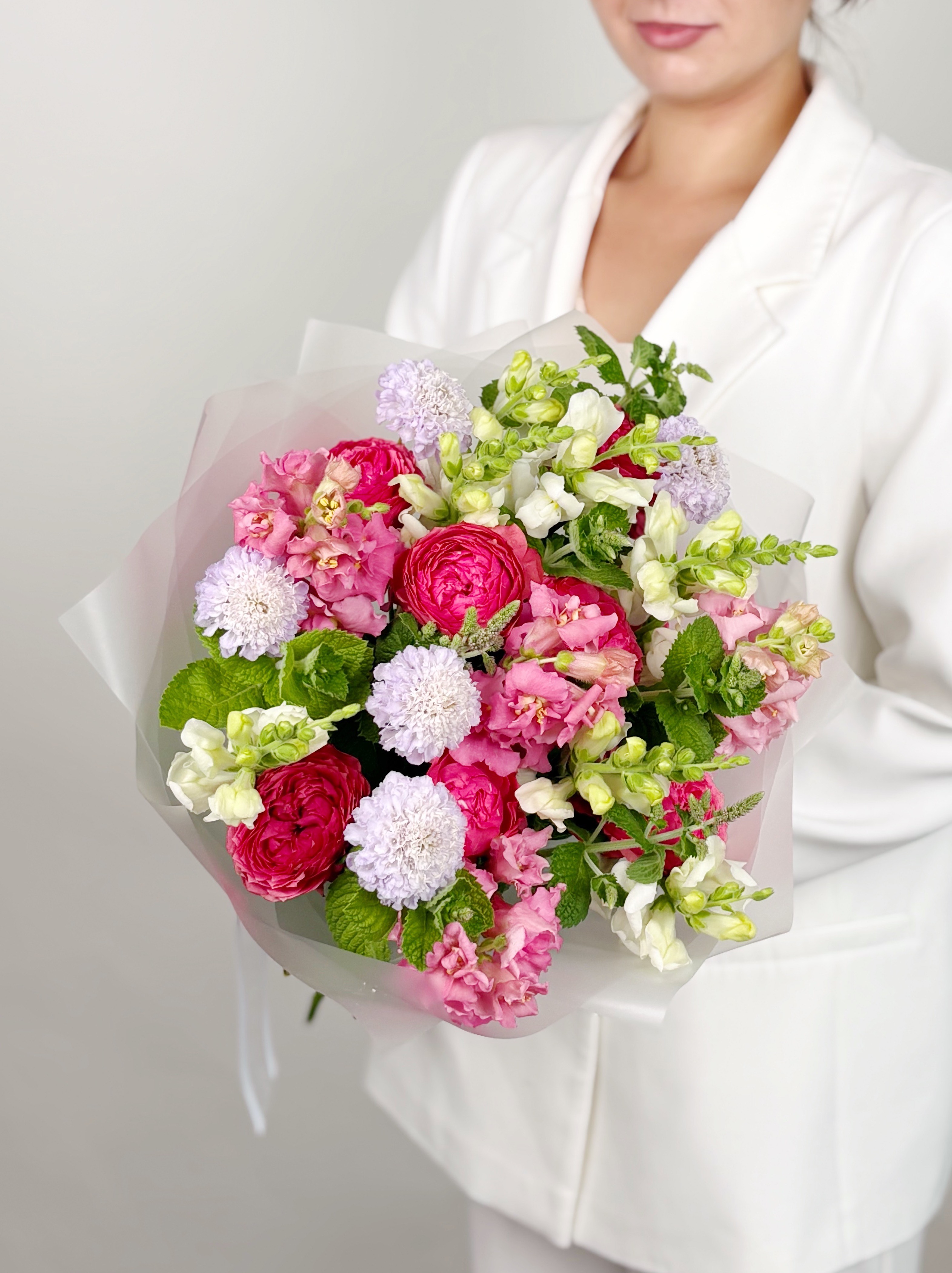 БУКЕТ С ПИОНОВИДНОЙ РОЗОЙ, СКАБИОЗОЙ И МЯТОЙ