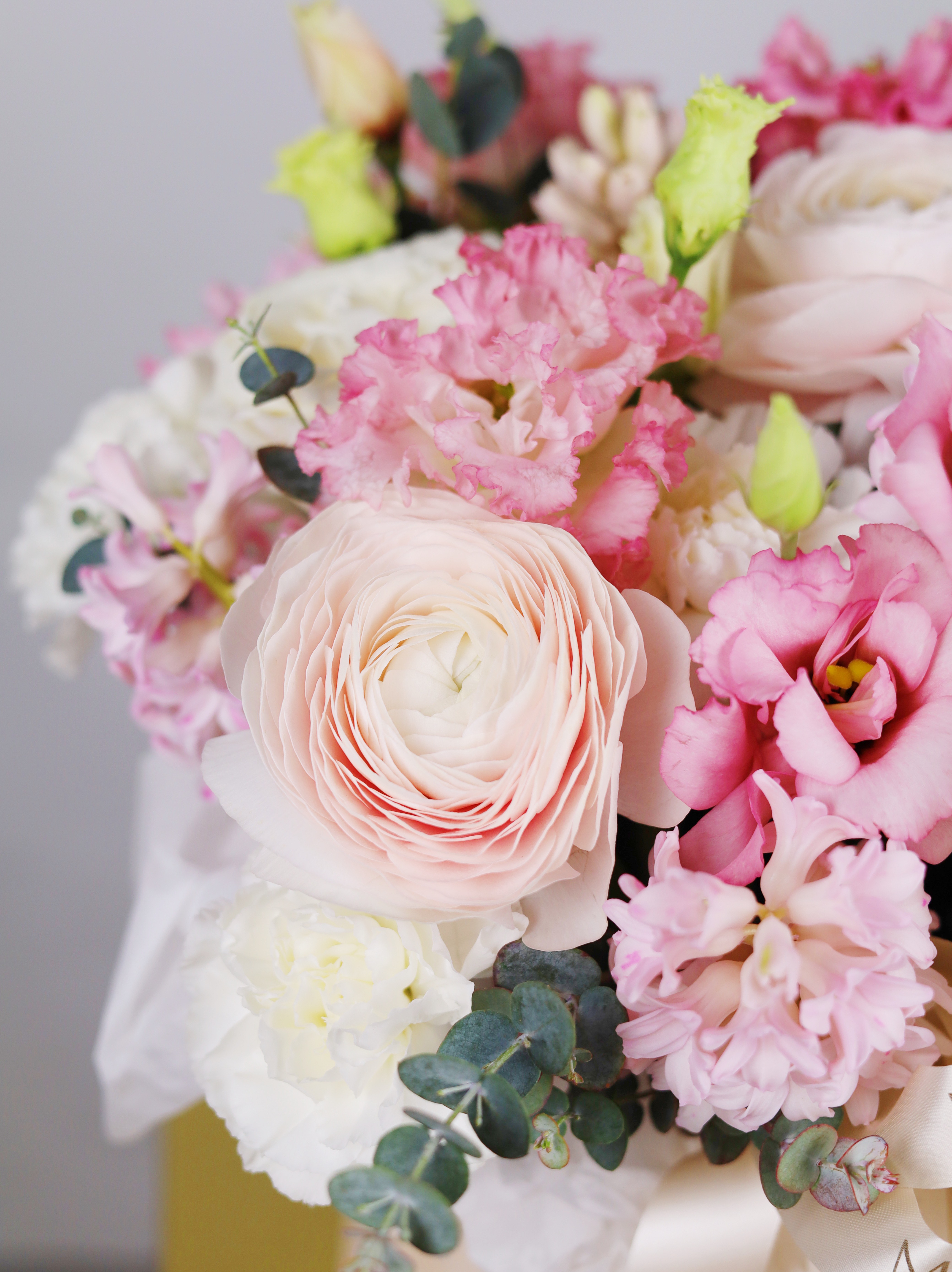—БУКЕТ С РАНУНКУЛЮСАМИ, ГИАЦИНТОМ И ЛИЗИАНТУСОМ В БАРХАТНОЙ КОРОБКЕ
