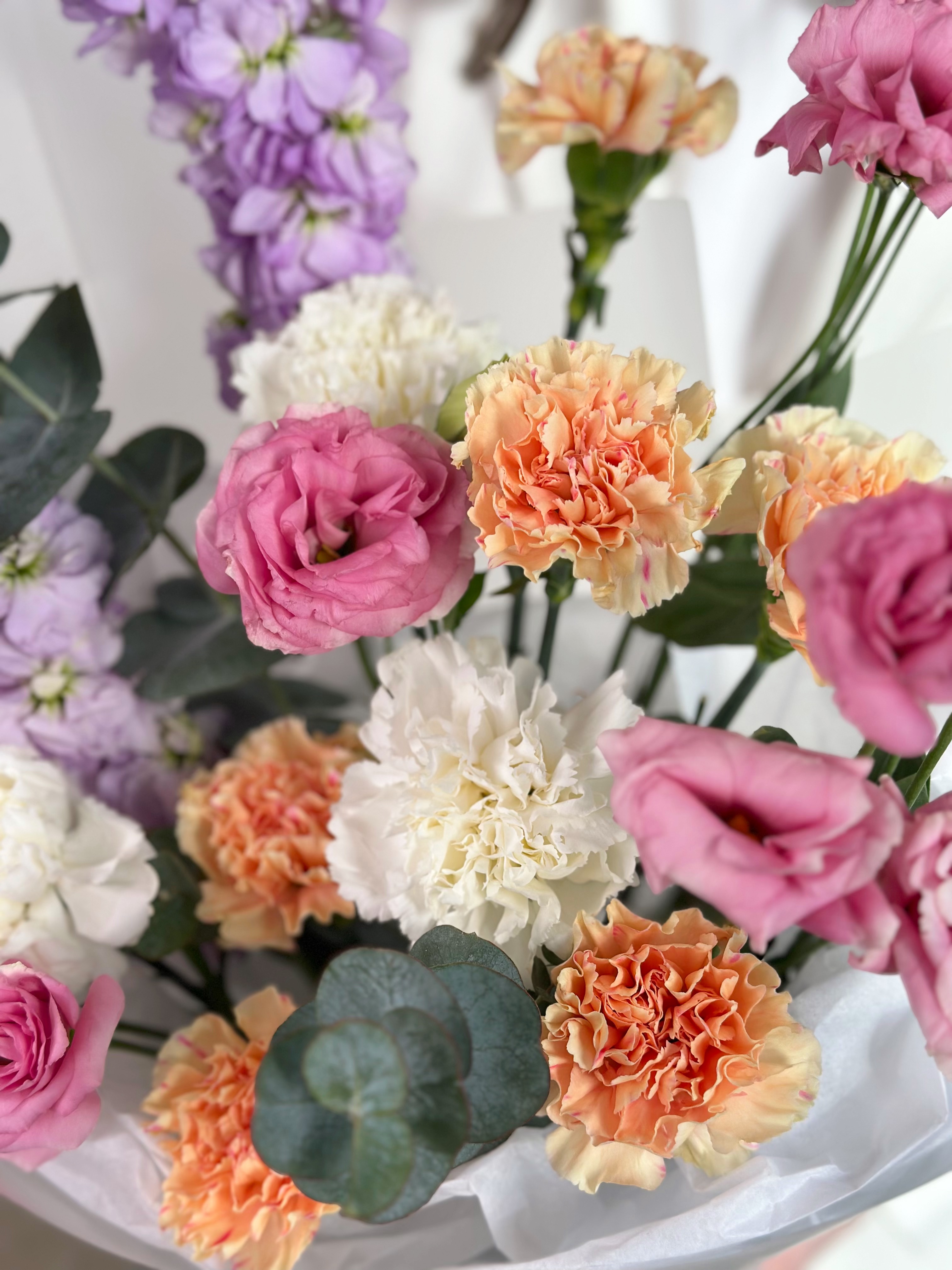 БУКЕТ В ПАСТЕЛЬНЫХ ОТТЕНКАХ С МАТТИОЛОЙ, ЭУСТОМОЙ И ГВОЗДИКОЙ