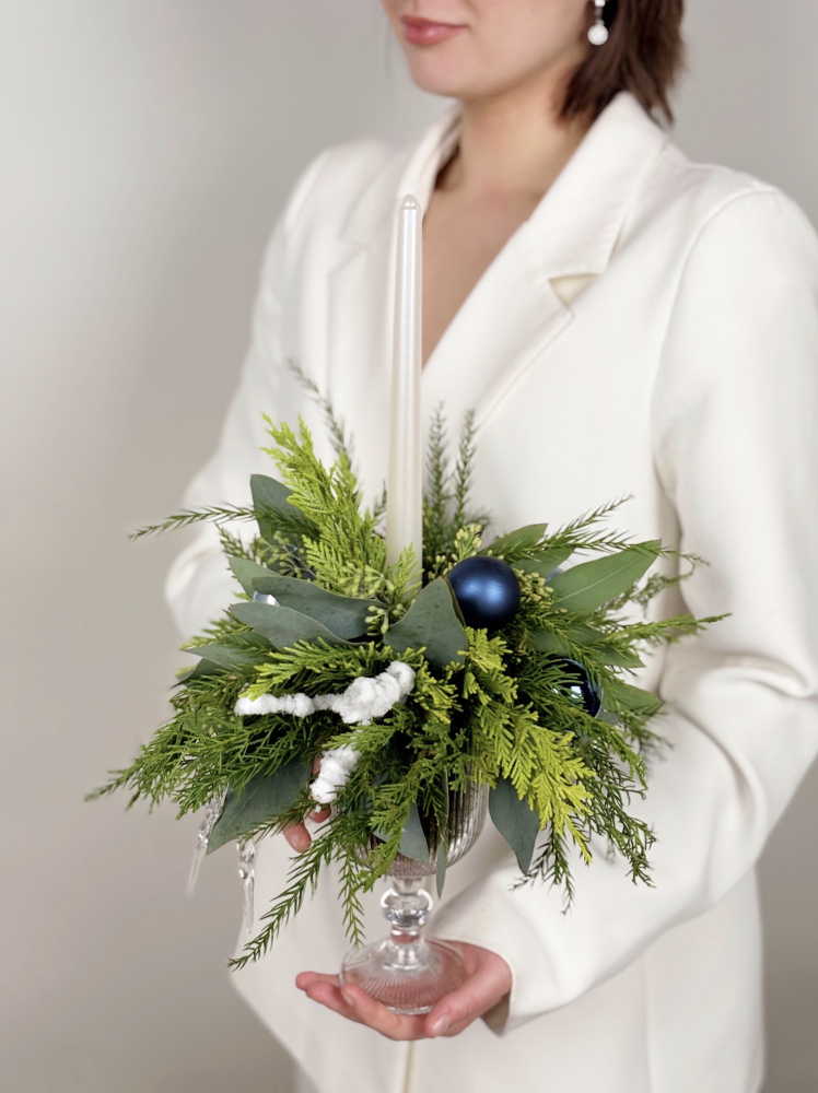 ХВОЯ В БОКАЛЕ СО СВЕЧЕЙ СЕРЕБРИСТОМ ОТТЕНКЕ