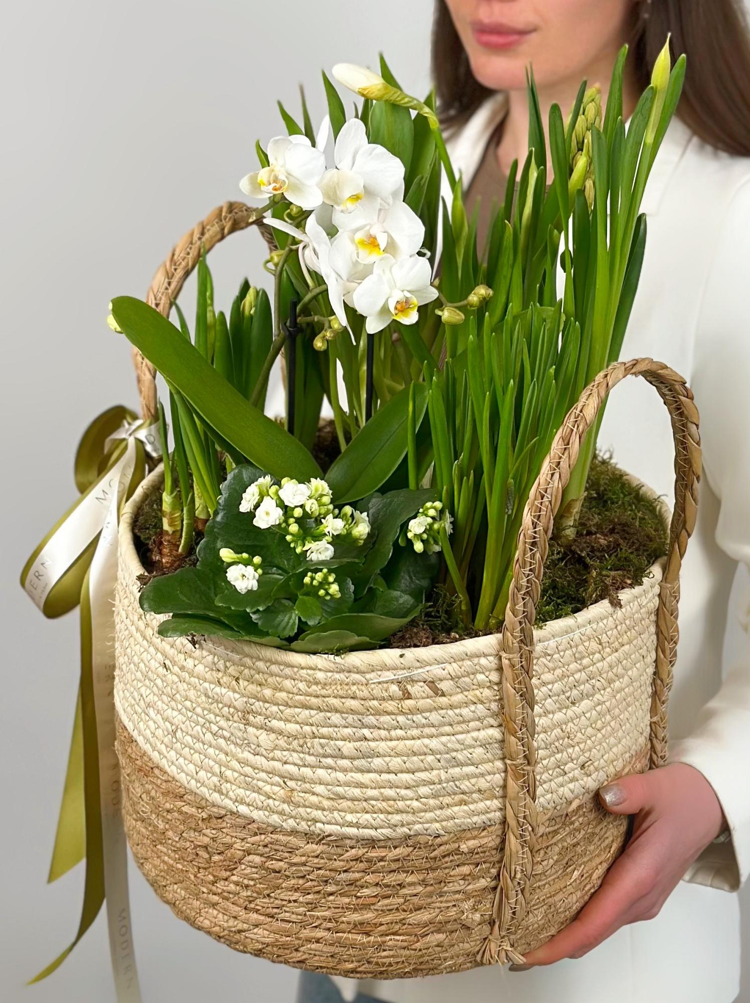 КОРЗИНА С ЛУКОВИЧНЫМИ ВЕСЕННИМИ ЦВЕТАМИ И ОРХИДЕЕЙ №21