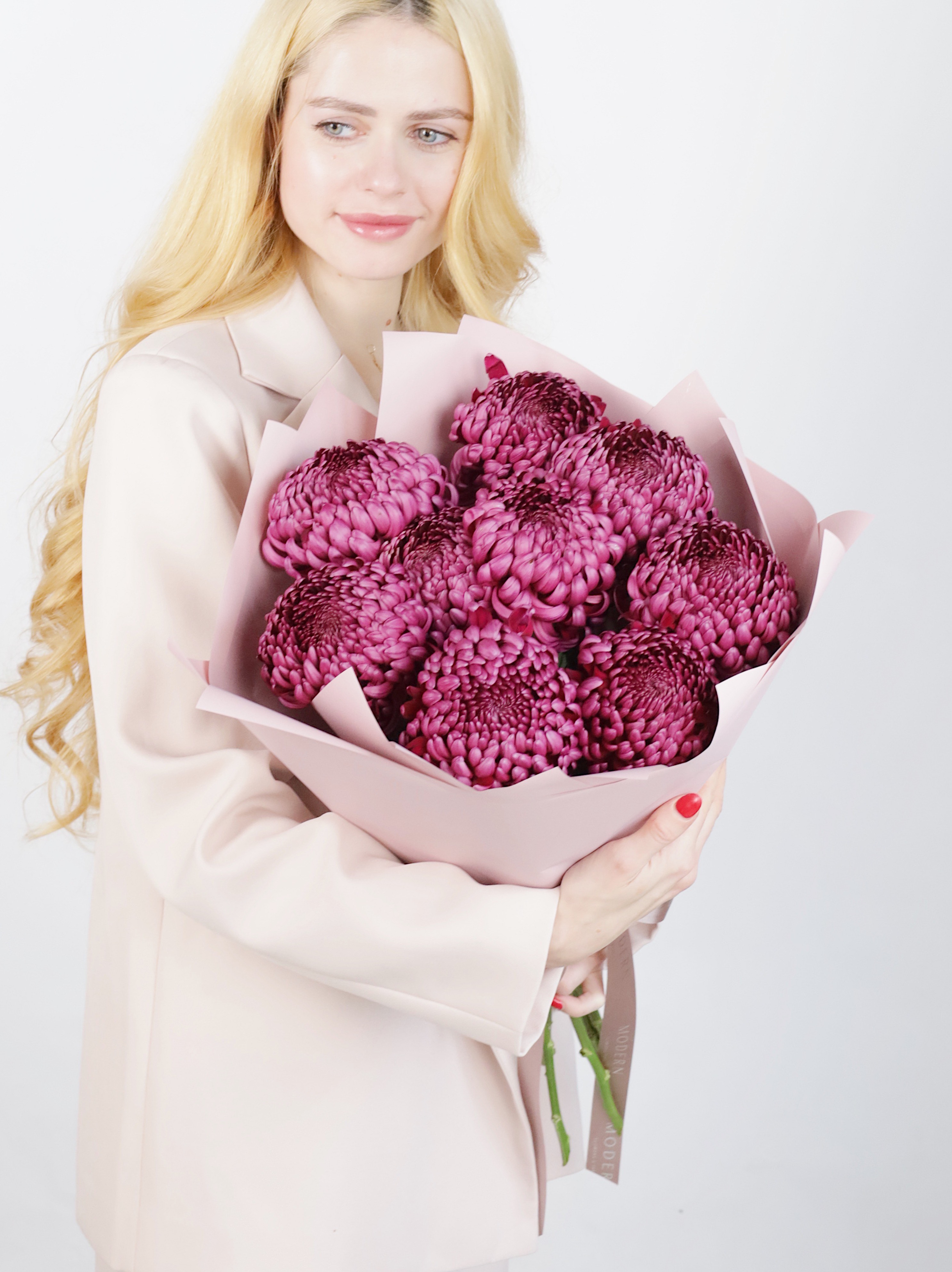 КРУГЛЫЙ БУКЕТ ИЗ ХРИЗАНТЕМЫ БИГУДИ 9 ШТ