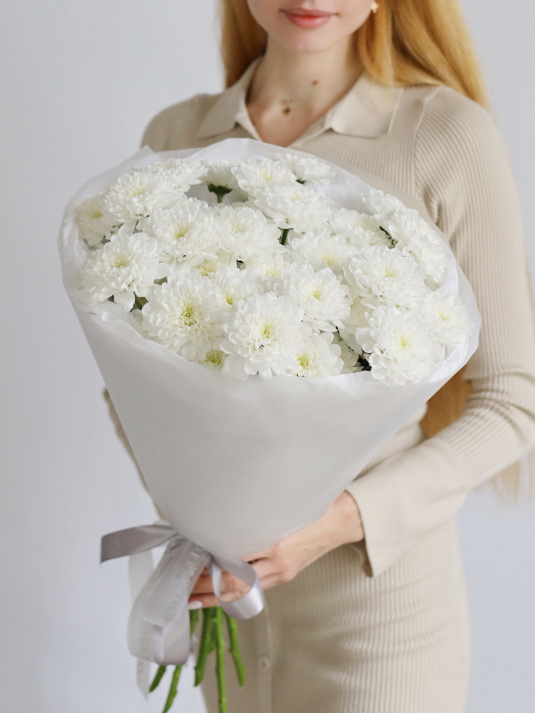 Купить букет белых хризантем можно на modernflowersfarm.ru, выбрав круглый классический, садовый или раскидистый подарок, оформленный в: